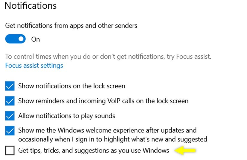 - Kalian bisa mematikan opsi get tips, tricks, and suggesstions as you use windows.